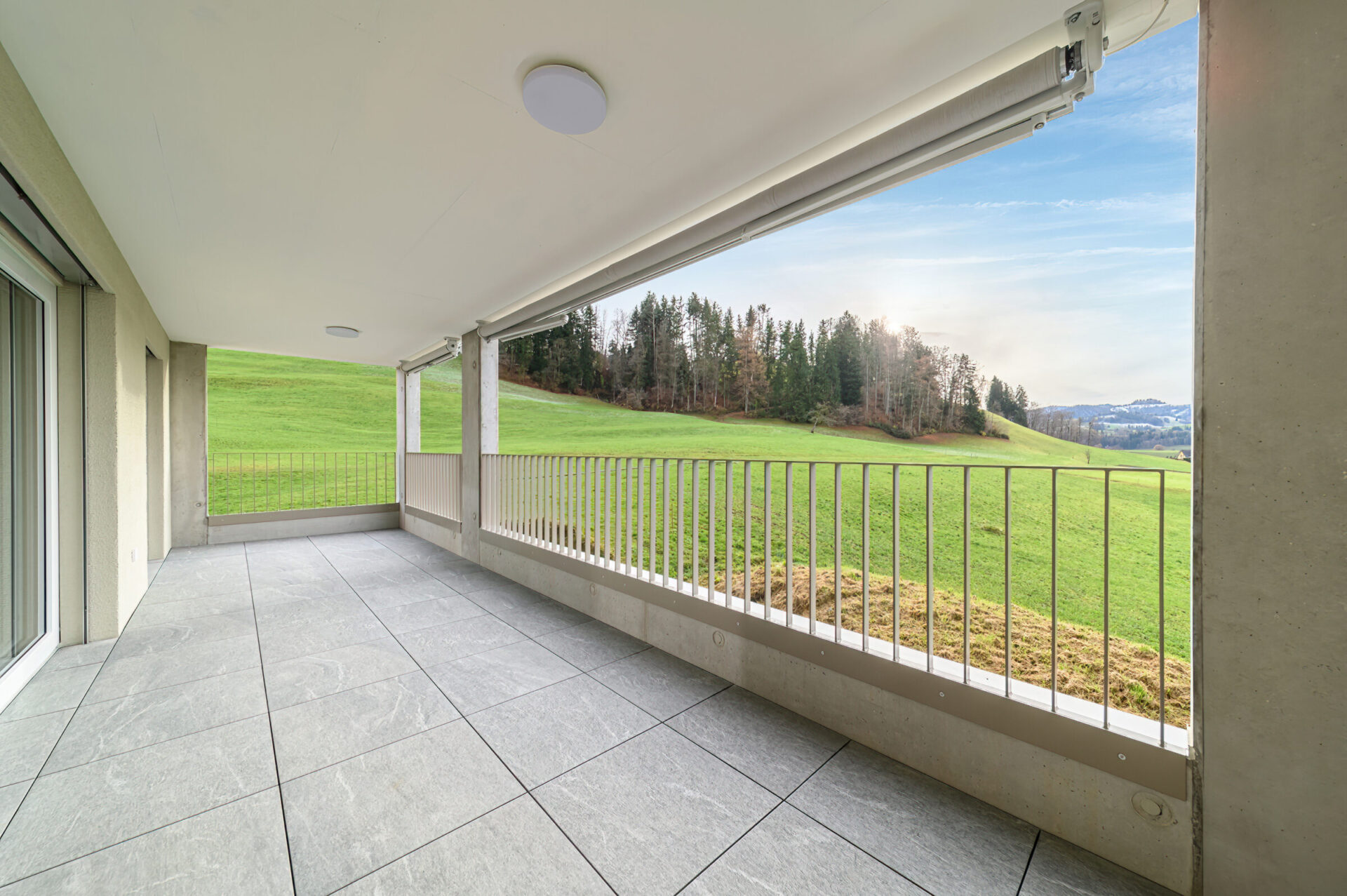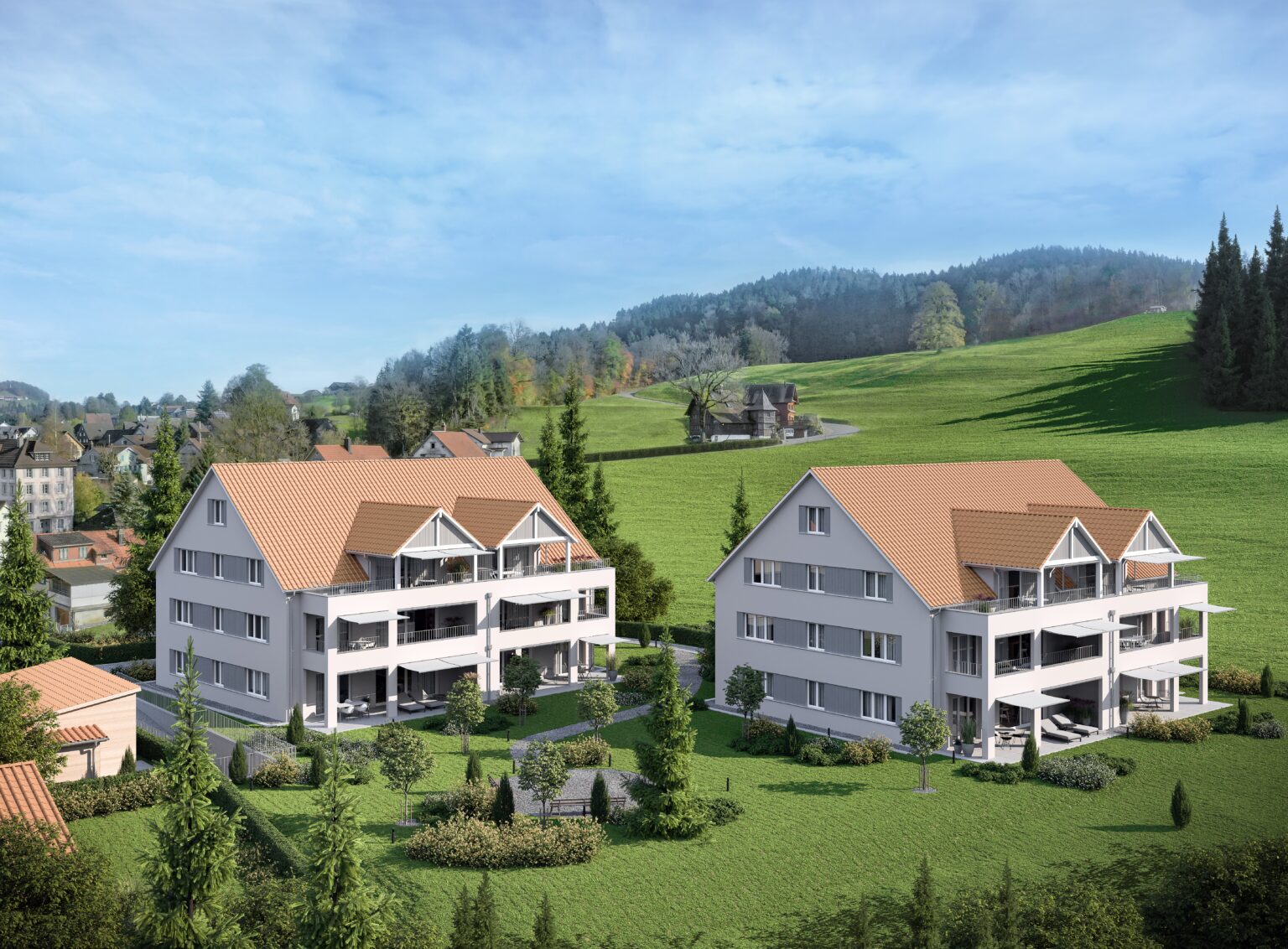 Beim Raumkonzept setzen die Häuser auf raumhohe Fensterfronten, welche viel Licht und Sonne bis tief in den Wohnraum fliessen lassen. Die grosszügigen, auf die ganze Wohnungsbreite vorgelagerten Terrassen und Balkons lassen Innen- und Aussenräume zu einem Ganzen verschmelzen und ermöglichen ein einzigartiges Wohnambiente.